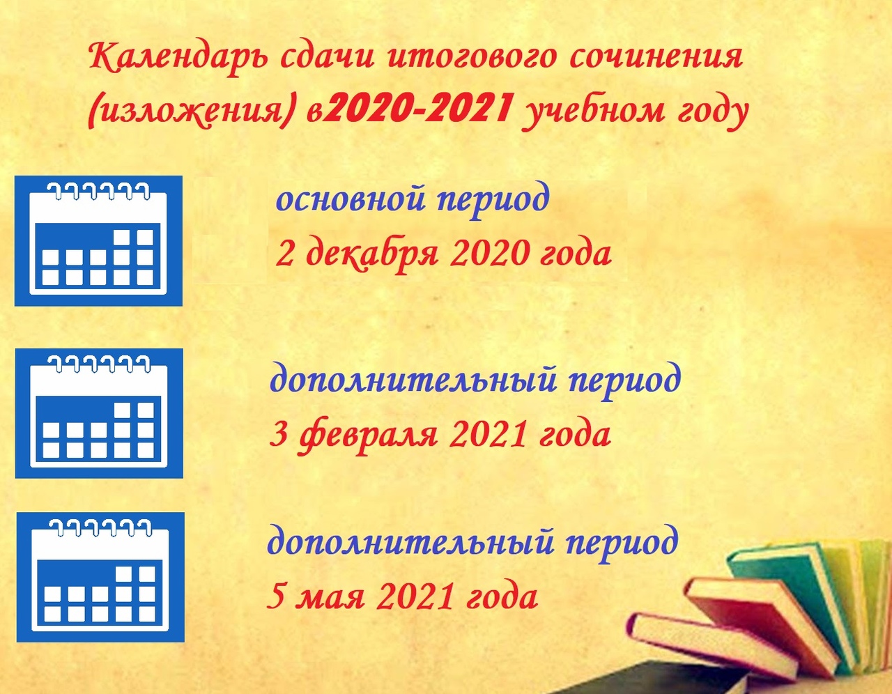 Итоговое сочинение (изложение) проводится в первую среду декабря, т.е. 2 декабря 2020 года. Продолжительность написания итогового сочинения (изложения) составляет 3 часа 55 минут (235 минут).